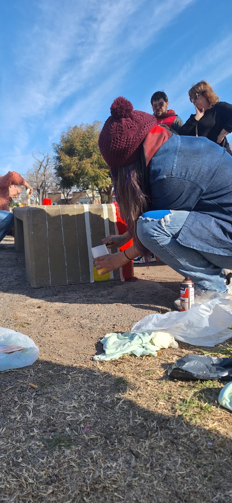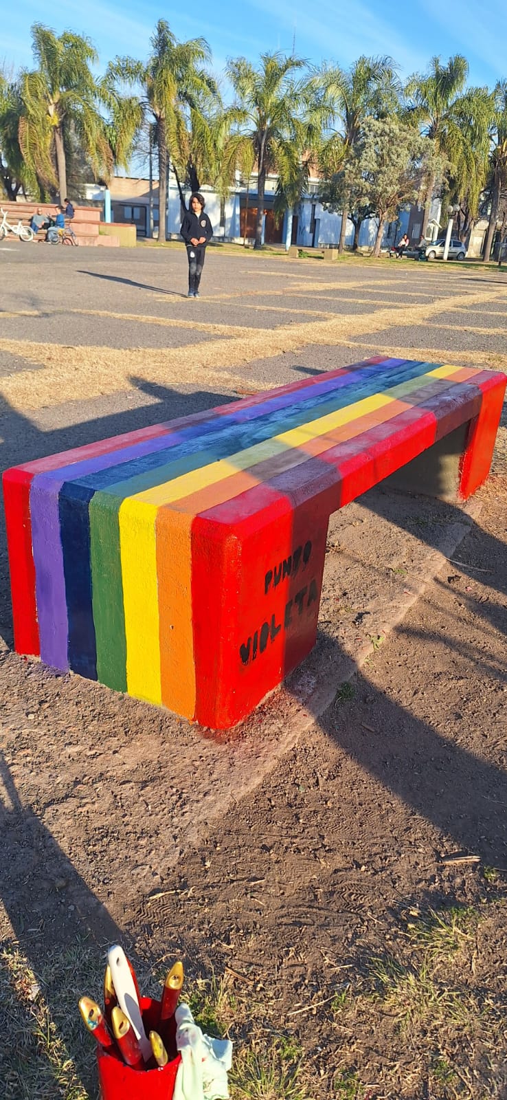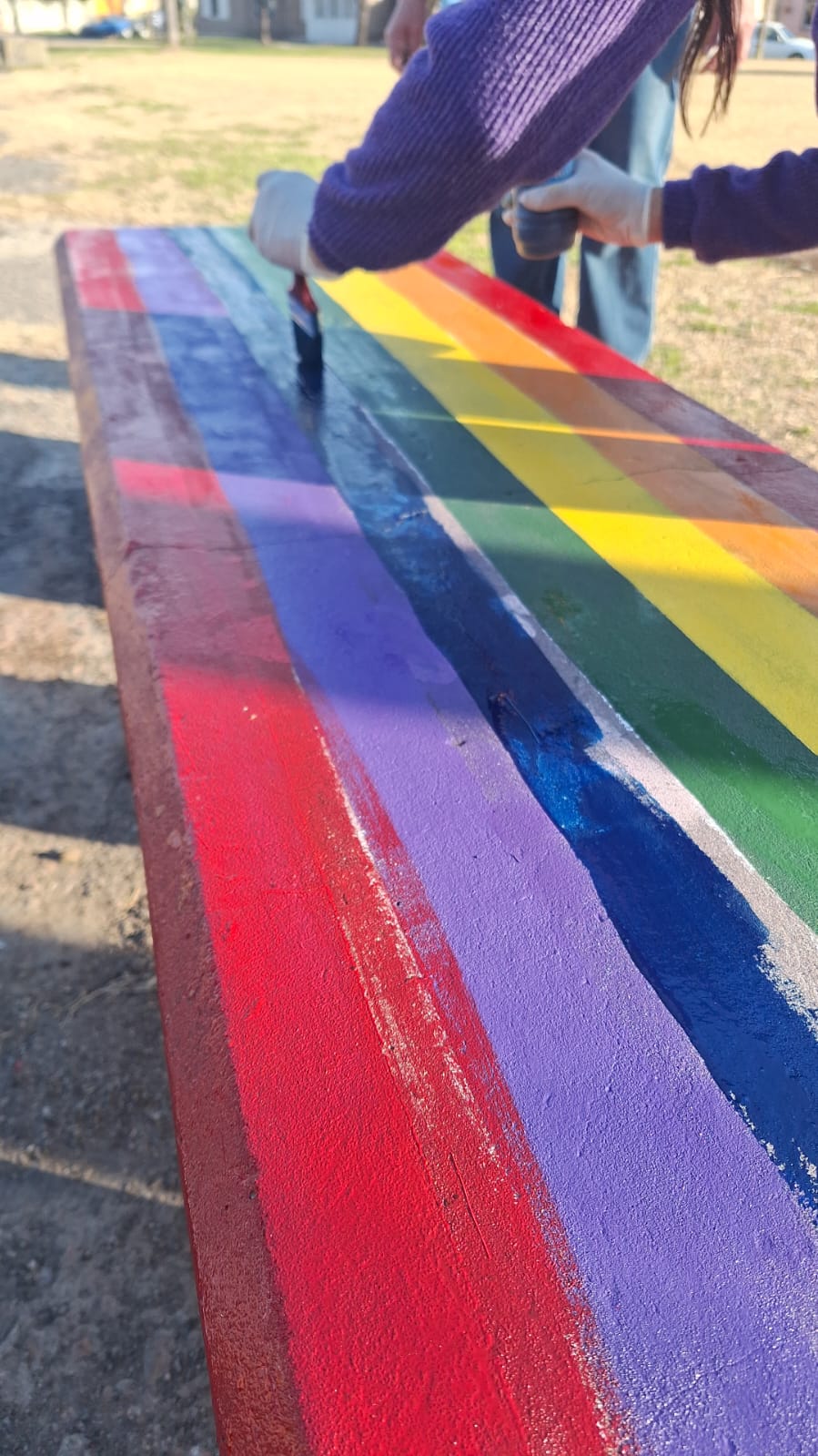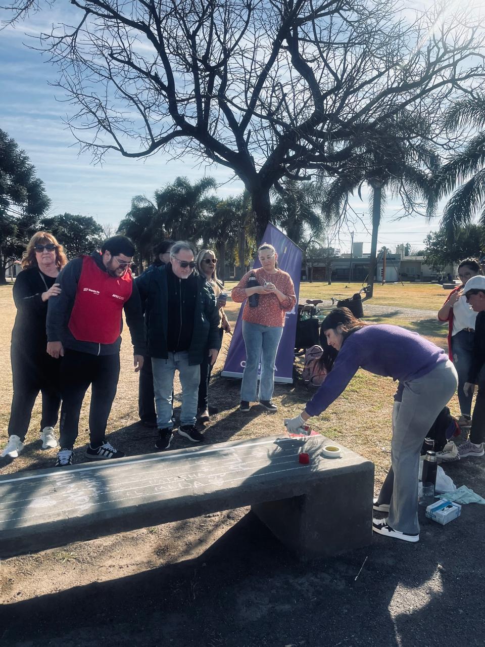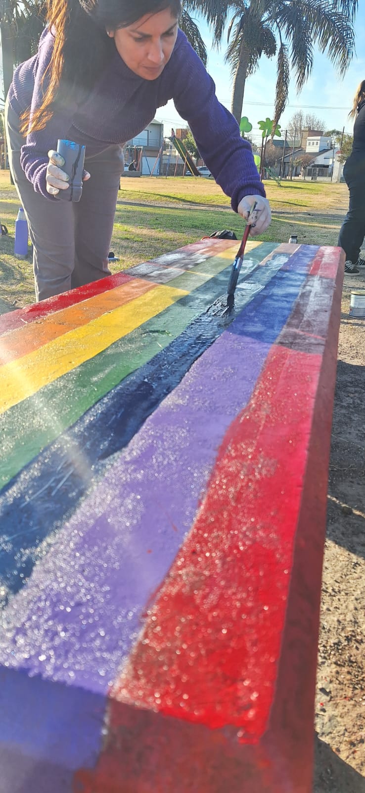Pintamos de forma colectiva un banco con los colores del orgullo, conversamos alrededor de unos mates y reflexionamos sobre el cuidado, el derecho a ser y las redes que nos sostienen. La propuesta buscó visibilizar derechos, recuperar la ternura como lenguaje político y habitar el espacio público desde la inclusión.
