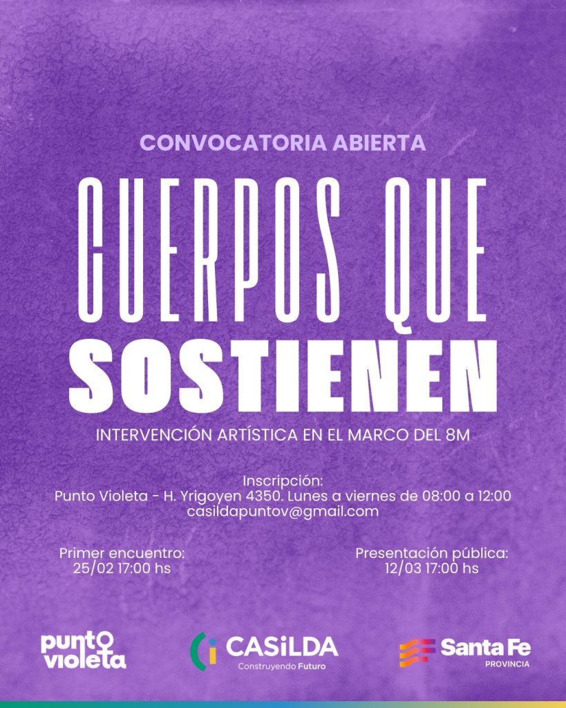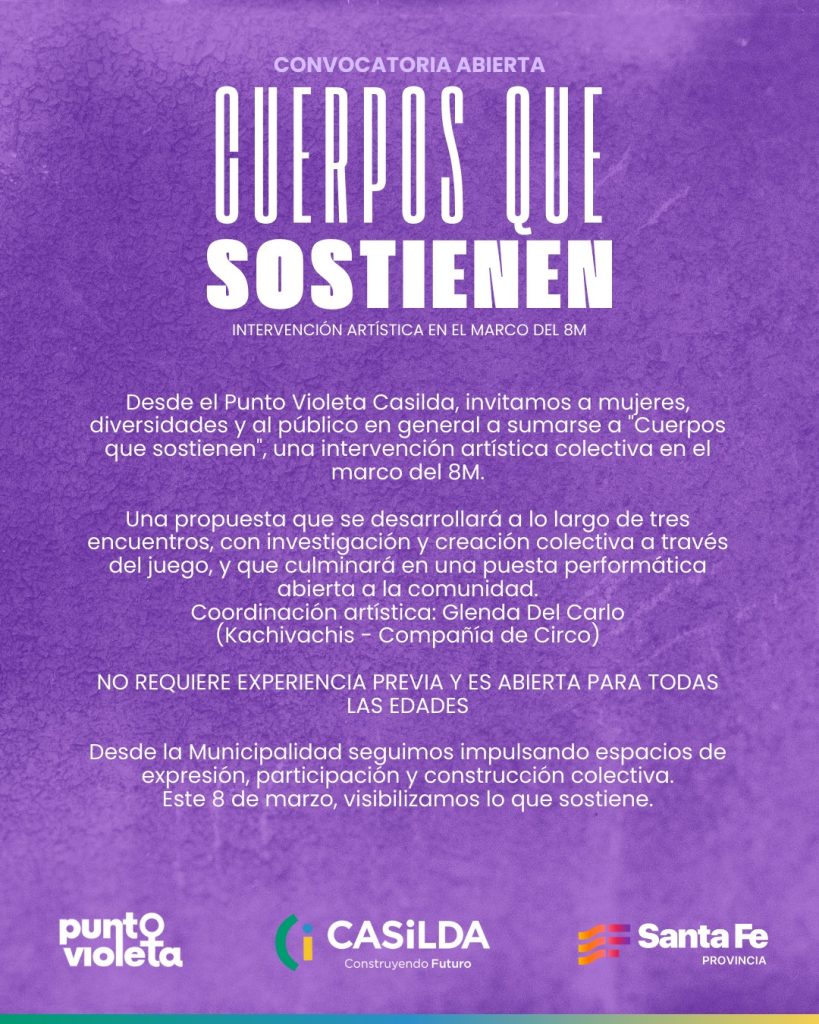 Desde el Punto Violeta Casilda, invitamos a mujeres, diversidades y al público en general a sumarse a “Cuerpos que sostienen”, una intervención artística colectiva en el marco del 8M.