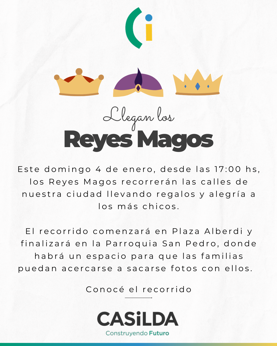 Este domingo 4 de enero, desde las 17:00 hs, los Reyes Magos recorrerán las calles de nuestra ciudad llevando regalos, sonrisas y mucha ilusión a los más chicos.