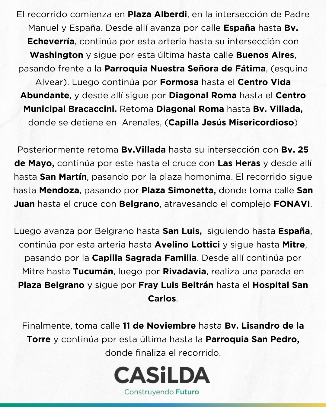 Finalmente, toma calle 11 de Noviembre hasta Bv. Lisandro de la Torre y continúa por esta última hasta la Parroquia San Pedro, donde finaliza el recorrido.