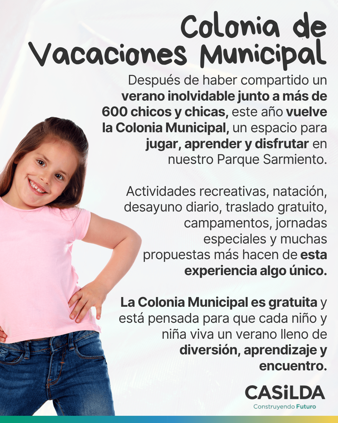 Después de un verano inolvidable junto a más de 600 chicos y chicas, este año desde la Dirección de Deportes de la Municipalidad de Casilda volvemos con una nueva edición de nuestra Colonia de Verano, un espacio gratuito para jugar, aprender y disfrutar en nuestro querido Parque Sarmiento.